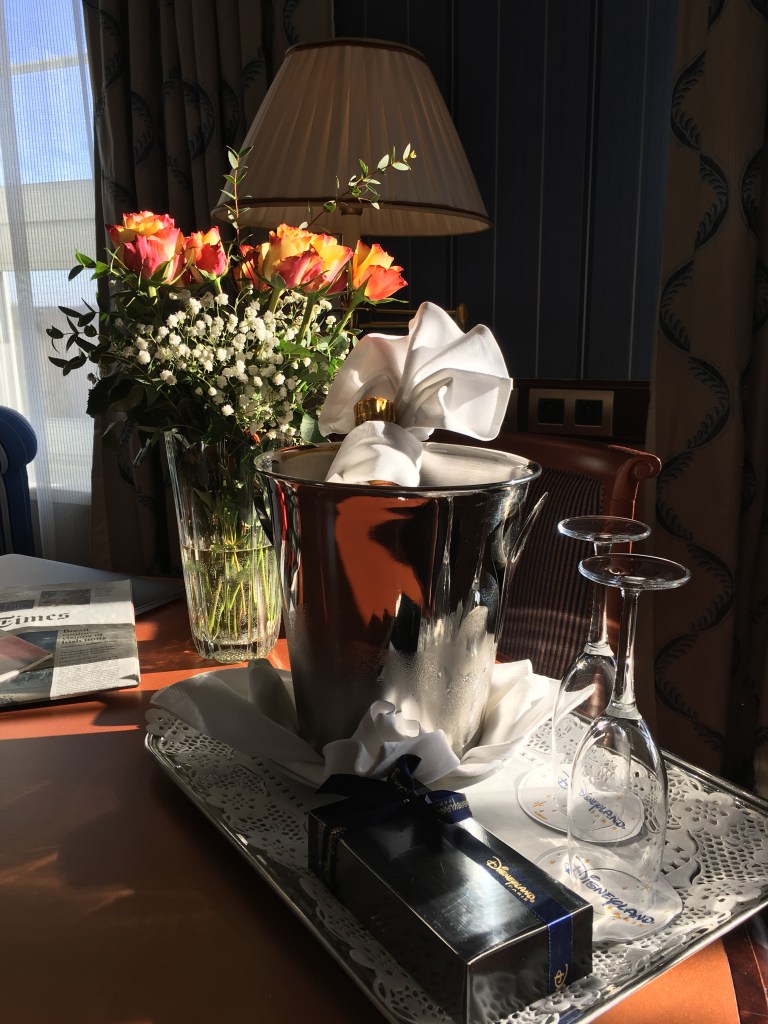 Compass Club perk -flowers, chocolate and champagne on arrival, plus a mickey mouse stuffy.